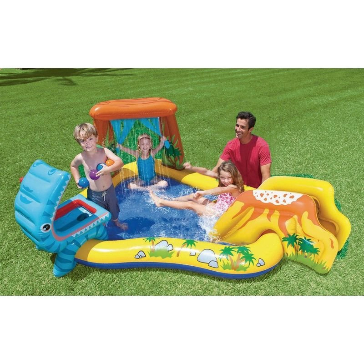 Pancsold át a forró napodat az aranyos kis medencédben! A Dinoszaurusz játékcenter nem csak egy egyszerű felfújható gyerekmedence, hanem egy extra párnázott csúszdával, levehető spriccelővel, felfújható dinóval és 6 darab színes dinoszaurusz kajagolyójával ellátott szuperszórakoztató mini strand! Mulasd hát át a nyári szünetet barátaiddal, és lubickoljatok a vízben kifáradásig. A Dinoszaurusz játékcenter méretei: 249 x 191 x 109 cm. A terméket 2 éves kortól ajánljuk.