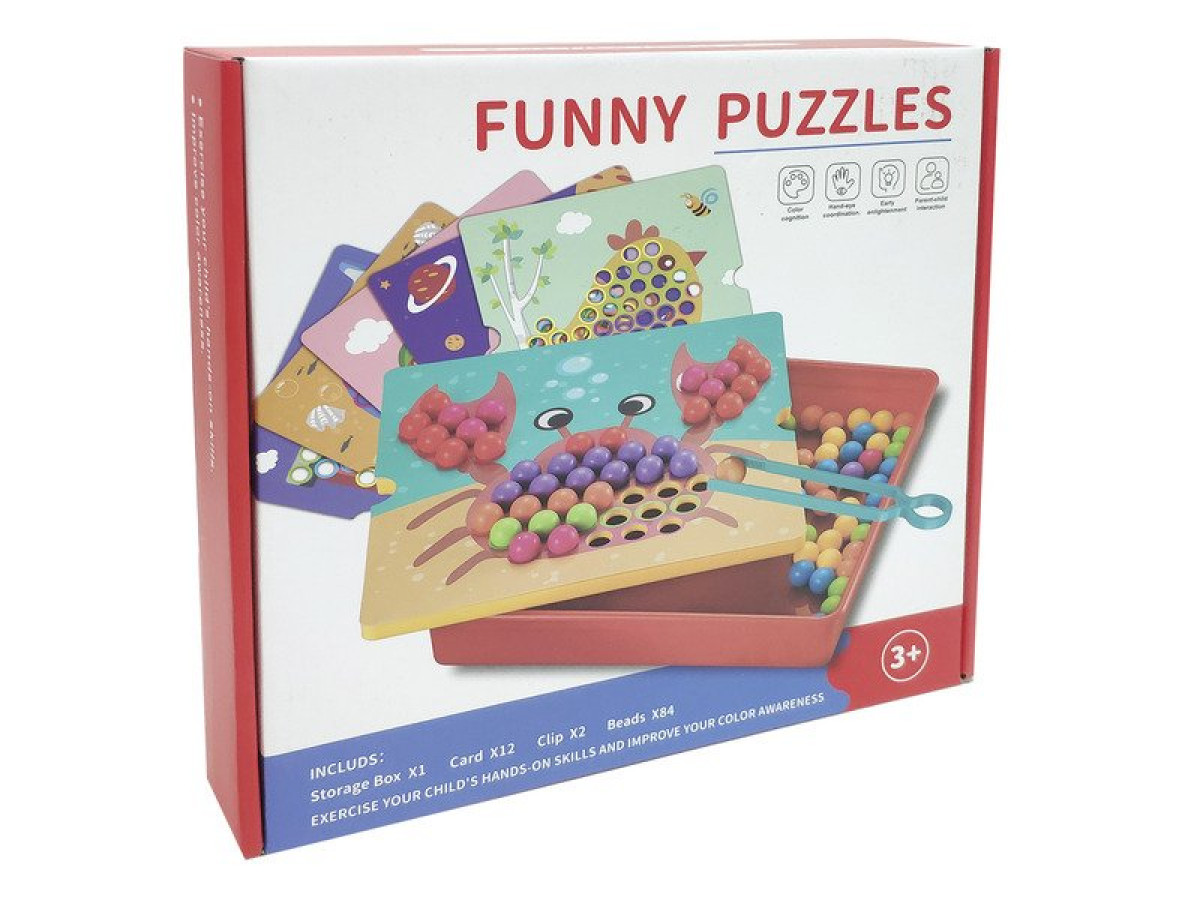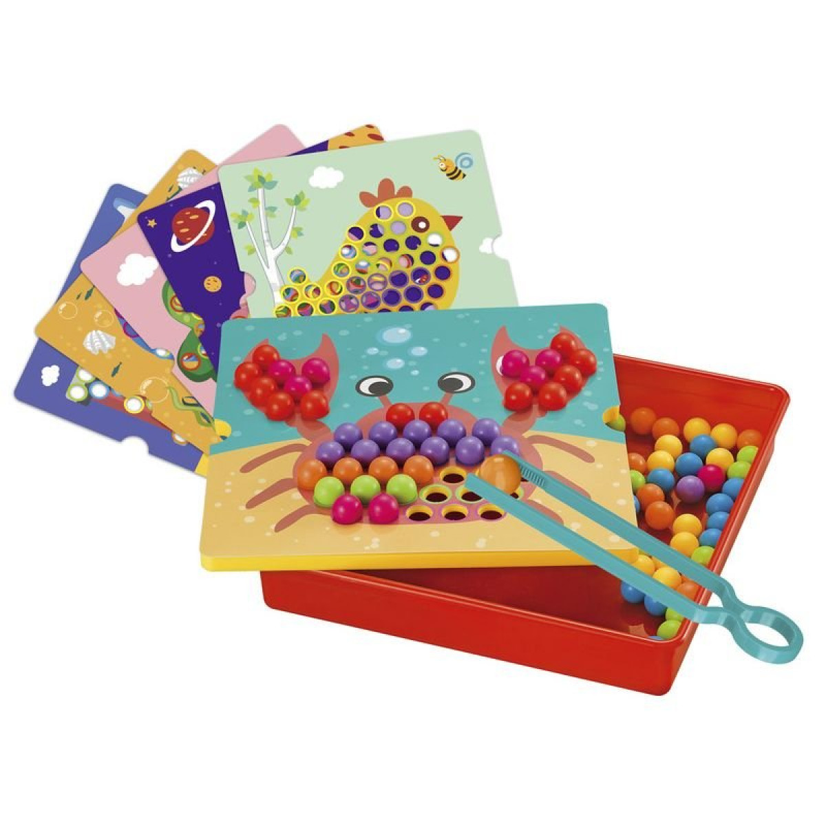 A doboz tartalmaz 12db lapot és 84db színes golyót. A golyókat a legügyesebbek a mellékelt csipesz segítségével rakhatják a helyükre.