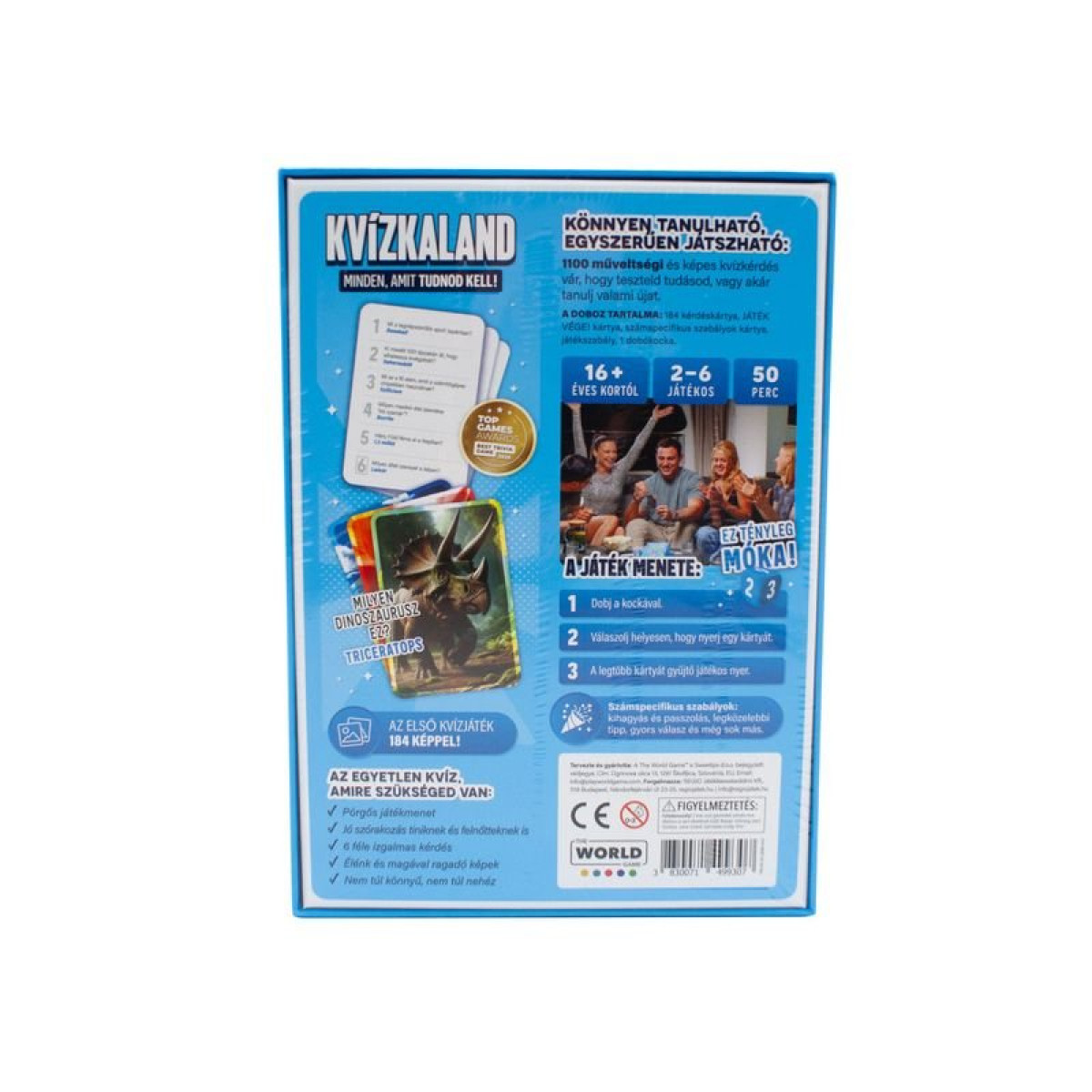 Kvízkaland: 1100 kérdés, 2–6 játékos, kb. 50 perc. Válaszoljatok témakörökből, haladjatok előre, és derüljön ki, ki a legfelkészültebb!