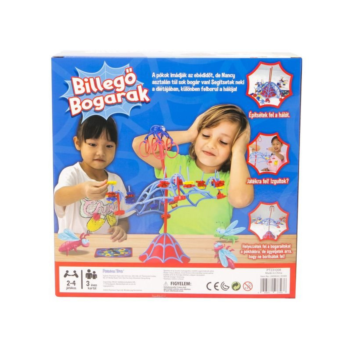 Társasjáték - Billegő bogarak Játékosok száma: 2-4 játékos, Korosztály: 3 éves kortól ajánlott. A játék célja: Helyezd fel az összes bogarad anélkül, hogy ledőlne a pókháló. Ellőkészületek: Építsük fel a nagy pókhálót. Óvatosan helyezzük fel a 4 darab kis hálót a nagy pókháló széleire. A bogarakat válogassuk szét színek szerint. 2 játékos esetén 2-2 színt válasszunk magunknak. 3 vagy 4 játékos esetén mindenki 1 színt válasszon. A kiválasztott színekhez tartozó bogarakat minden játékos vegye magához. Játék: A legfiatalabb játékos kezd, a kör az óramutató járással megegyezően halad. Minden játékos pörget a tárcsán. A kipörgetett fajtájú bogarat felhelyezi az általa választott kis pókháló egyikére. A nyertes: Az a játékos nyer, aki elsőként helyezi el az összes rovarát a hálókon, vagy (ha több mint 2-en játszanak) az a játékos, akinek a legkevesebb rovara marad a kezében a háló felborulása után. Az a játékos veszít, aki feldönti a hálót. Játékra fel!