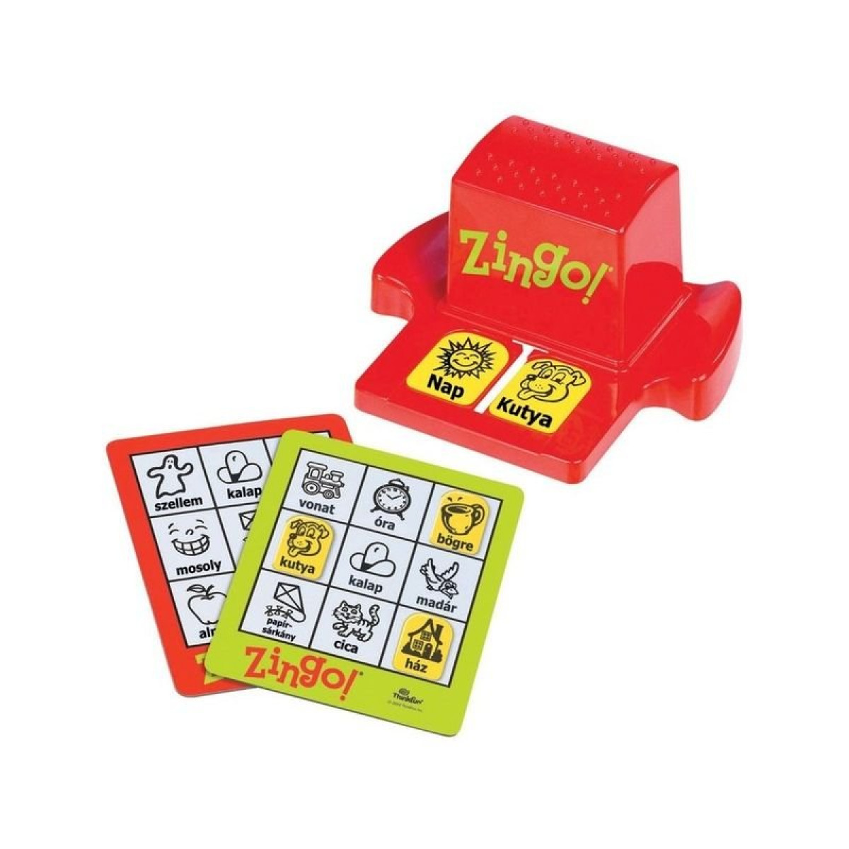 Thinkfun: Zingo Játssz és tanulj társasjáték Játékosok száma: 2-8 játékos, Korosztály: 4 éves kortól ajánlott, Játékidő: 5 perc. Világszerte számos országban, számtalan díj nyertese a Zingo. Egy gyors, szórakoztató párosító játék. Nagyszerű játék azoknak, akik még nem tudnak olvasni, és azoknak is, akik már tudnak, mert a játékhoz a képek és a leírt szavak egyaránt használhatóak. Ezzel a játékkal egyszerűen gyakorolható a szófelismerés, a szópárosítás, a helyesírás, fejleszti a szókincset, a koncentrációt, a memóriát és a szóbeli kifejezést. A játék egyszerű: töltsd fel a Zingo adagolót, told előrefelé a tetejénél fogva, majd húzd vissza a tetejénél fogva és már látszik is két Zingo lapocska! A játék magyar nyelvű. Tartalom: 1 db Zingo! Adagoló, 72 db műanyag képes lapocska, 8 db kétoldalas Zingo! tábla, 1 db játékszabály. Csomagolás mérete: 20 x 26 x 9 cm.